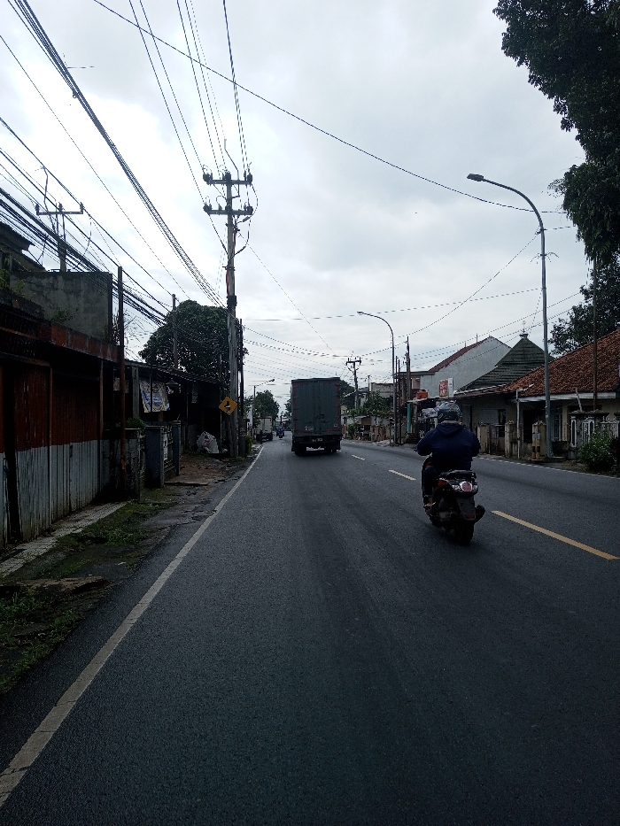 The image displays an overcast daytime street scene in the city of Kamji Na-Yekha, Bhutan. An asphalt road, marked with a solid white line on its left edge and a dashed yellow line in the right lane, recedes into the distance. In the mid-ground, a person wearing a dark blue jacket and a dark-colored helmet operates a dark scooter, moving away from the viewer. Further ahead on the road, a dark green box truck is also proceeding in the same direction. On the left side of the road, a paved shoulder borders a rusty, corrugated fence or wall, above which a concrete structure is visible. A utility pole heavily laden with a dense network of overhead electrical wires stands prominently on the left. Further down, a yellow triangular road sign with a curved arrow is partially discernible. Buildings, featuring various roof styles including terracotta tiles, line both sides of the street, suggesting a mix of residential and commercial properties. On the right side, another utility pole with a curved street light arm is present. Green foliage from trees partially obscures some buildings and the sky on the far right. The sky is uniformly overcast.
