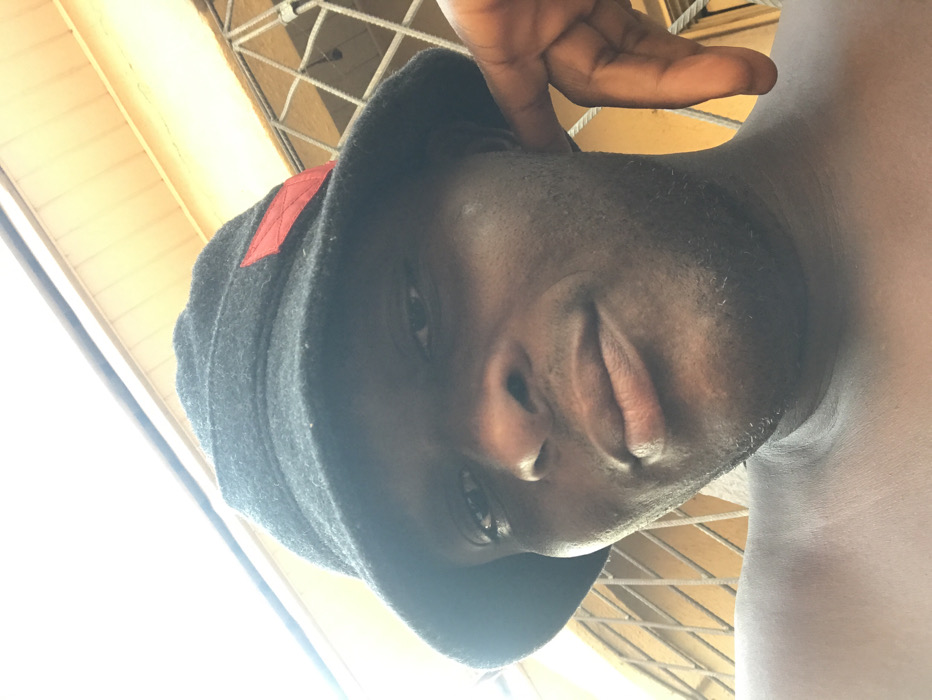 A close-up, low-angle selfie shows a dark-skinned person wearing a black bucket hat with a red patch. The hat casts a shadow over their face. Their bare shoulder and chest are visible. They are touching their face with their hand. Behind them, a window and ceiling are discernible.