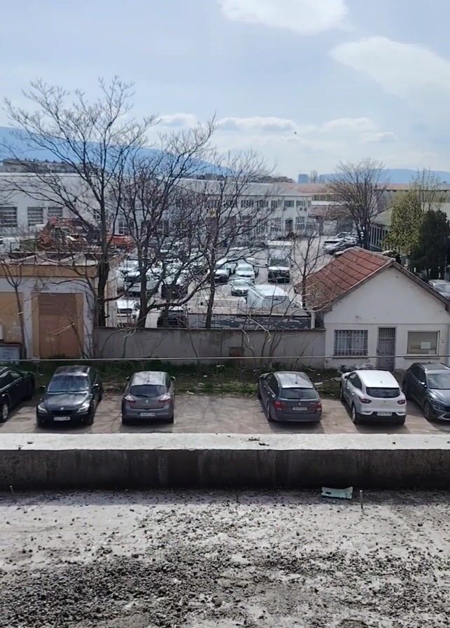 view from a high angle overlooking a parking lot and surrounding urban area on a partly cloudy day. A low concrete barrier or wall runs across the bottom of the frame, with a gritty, unfinished surface visible in front of it. In the foreground, several cars are parked neatly in a row along the wall. Behind them, a mix of industrial and residential buildings make up the urban landscape. One small white building with a red roof stands out amidst the larger structures. In the distance, a mountain range is visible. A strip of white material lifts from the hood of a parked car and whips in the wind. The video is stable, but the camera position shifts slightly to the left during the course of the video.