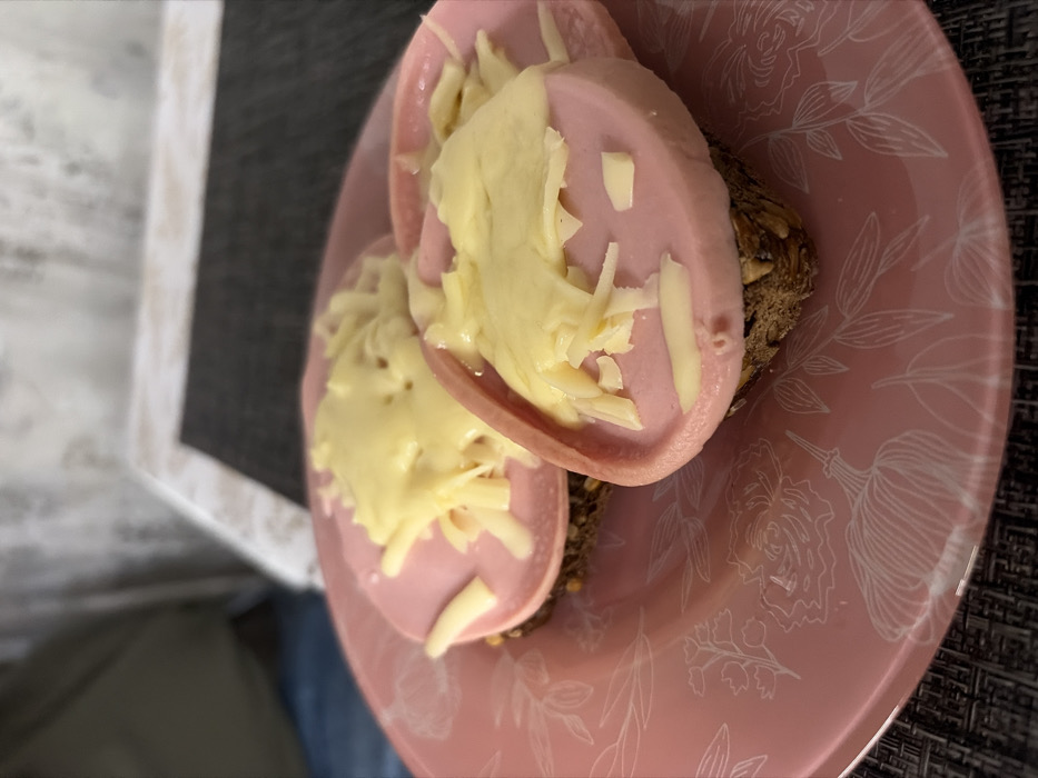 The image displays two open-faced sandwiches positioned on a round, pink ceramic plate adorned with white botanical line art. Each sandwich consists of a slice of dark, seedy bread, topped with a thick, circular slice of pale pink cooked sausage, which is partially covered by melted yellow cheese and some visible shreds of unmelted cheese. The plate rests on a dark, textured placemat. In the blurred background to the left, a person's torso and upper leg are visible, wearing an olive-green top and blue jeans. Behind the person and the plate, a light-colored wall or vertical surface with a subtle texture and a light-colored trim is discernible. The scene is set indoors, within the city of Saint Petersburg, Russia. No active actions or explicit interactions are depicted.