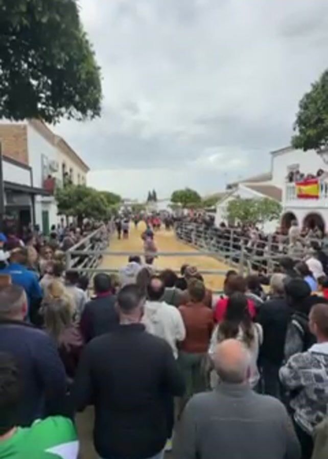 A crowd watches a bull run through a cordoned-off street. Many people are standing behind metal fences on both sides of a wide, sandy street, looking toward the far end where the bull is running. The buildings lining the street are mainly two stories and white. The Spanish flag hangs from a balcony. The sky is cloudy. Several trees are visible along the sides of the street.