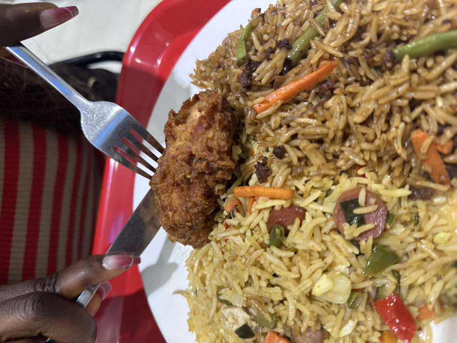 - "A fork holds a piece of fried chicken while a knife is poised to cut it, situated next to a plate of fried rice" by FM-So1mU2, licensed under CC BY 4.0