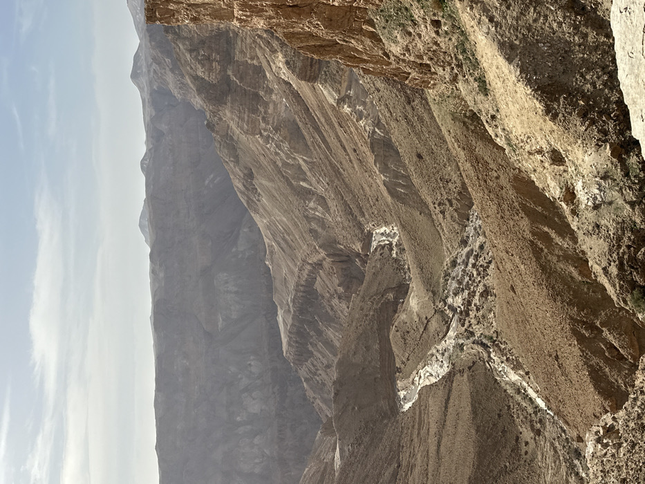 A geological formation under a pale sky showcases steep rock faces with stratified layers. The landscape features hues of brown, beige, and grey, with a distinct, winding vein of white rock or sediment snaking down the terrain. Sparse vegetation dots the rugged cliffsides. The scene conveys a sense of vastness, elevation, and the raw, natural forces that have shaped the earth's surface over time.