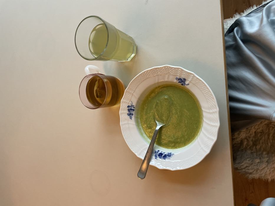 An overhead photograph captures a meal setting on a light-colored table within an indoor environment in Copenhagen, Denmark. A white ceramic soup bowl, featuring blue floral patterns and a scalloped rim, is positioned center-left, containing a quantity of smooth, green-colored soup. A silver spoon rests within the soup. To the upper right of the bowl, a translucent pink-tinted glass mug holds an amber liquid with a visible tea bag. Adjacent to the mug on its right is a clear, faceted glass tumbler filled with a pale yellow-green liquid. The table surface exhibits minor circular stains. Partially visible beneath the table are the lower torso and legs of an individual, clad in a light blue-grey, reflective fabric. A segment of shaggy, light brown material is visible on the floor to the bottom-left.