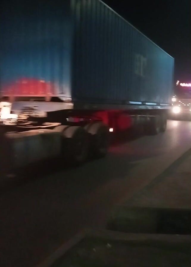 - "At night, a large truck pulling a shipping container moves through a street" by FM-KfFx13, licensed under CC BY 4.0