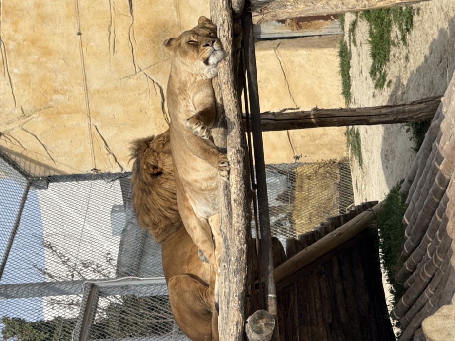 - "Two adult lions, a male and a female, are depicted resting on a raised wooden platform under natural sunlight" by FM-tFDjG2, licensed under CC BY 4.0