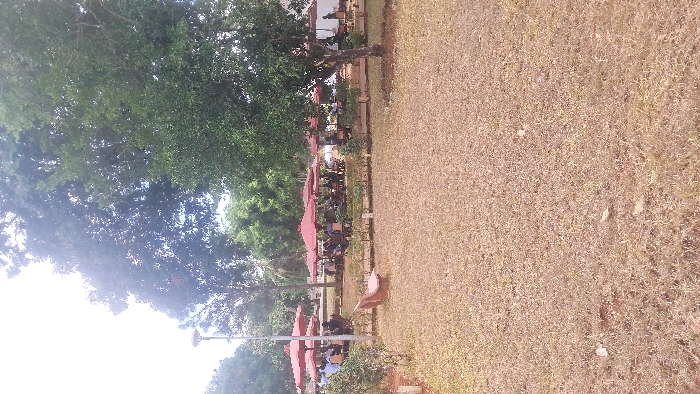 A park scene features a lush green tree on the left, partially obscuring the sky. In the middle, red umbrellas cover tables, suggesting an outdoor dining area. The ground is covered in dry grass and scattered stones. A street lamp stands among the trees. The scene evokes a tranquil, possibly outdoor cafe atmosphere, with the shift from green foliage to a drier landscape in the foreground.