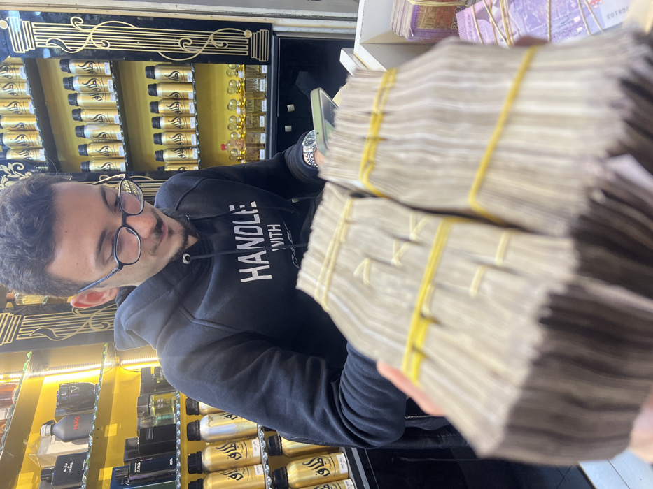 A man in glasses and a hoodie holds two large stacks of cash secured with yellow rubber bands. He appears to be in a store, with shelves stocked with perfume bottles and other items visible in the background. The shelves have decorative gold detailing. The man is glancing to the side, possibly at a phone in his hand.