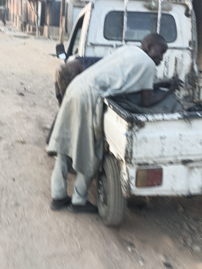 A blurry image shows two men working at the back of a small, white pickup truck. One man is leaning over the truck bed, seemingly focused on something inside. He wears a light-colored shirt. The other man, wearing a lighter color robe, stands slightly behind, facing the truck. The truck is parked on what appears to be a dirt road. The background suggests a sparse village setting with simple structures. The image is soft, making details indistinct.
