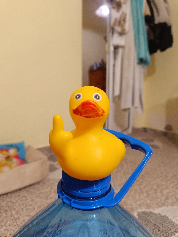 The scene depicts an indoor environment, presumed to be within a residential or utility room in Shumen, Bulgaria. The primary subject is a yellow rubber duck toy, positioned centrally and facing the viewer. The duck features blue eyes with black pupils and an orange-red beak. Its left wing is raised, with a single digit extended upwards, forming a 'middle finger' gesture. The duck rests directly on the dark blue screw cap of a large, translucent blue plastic water bottle, which occupies the lower portion of the frame. A blue plastic handle is attached to the neck of the bottle. The bottle contains clear liquid. The background consists of light yellow-beige painted walls and a light-colored tiled floor with darker grout lines. To the left, a light-colored pet bed with a colorful cushion is visible on the floor. To the right, an open doorway reveals an adjacent, out-of-focus room. Within this room, a bright light source is visible on the ceiling, and various items of clothing hang vertically on a rack or stand. A dark wooden cabinet or furniture piece is also dimly visible in the background of the adjacent room. No individuals are present in the image.