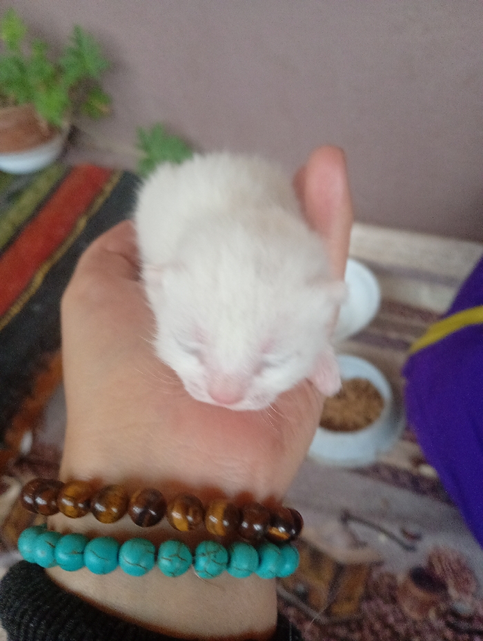 The scene depicts a newborn, white-furred kitten, eyes closed, being cradled in a human left hand