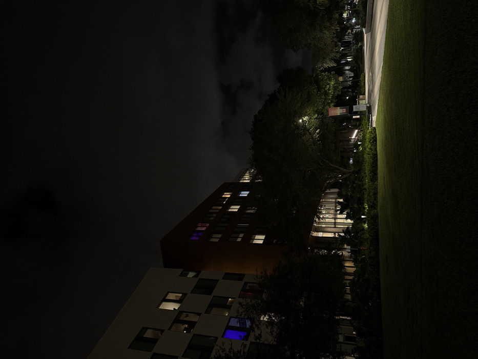This image depicts a nighttime scene on the University of Miami campus in Coral Gables, Florida, United States. The upper half of the frame shows a dark, cloudy sky. In the mid-ground, two multi-story, modern buildings are visible. The building on the left is light-colored (cream/off-white) with numerous square windows, some illuminated with warm white, blue, and a heart-shaped pink/red light. The building slightly behind and to the right is reddish-brown, also featuring multiple illuminated windows with warm white and purple lights. Between the viewer and the buildings, and extending to the right, are dense clusters of dark green trees and shrubs, some partially illuminated by ground-level and pole-mounted lights. A bright streetlight in the mid-right illuminates a portion of a tree canopy and the adjacent ground. In the lower left and center foreground, a manicured, dark green grassy lawn is visible. To the right of the lawn, a light-colored paved pathway curves into the distance. A red and orange banner with a university crest is affixed to a pole beside the pathway, near the illuminated tree. No individuals, vehicles, or discernible actions/interactions are present in the scene. The overall environment is well-lit in specific areas, contrasting with the dark night sky and deep shadows cast by the vegetation.
