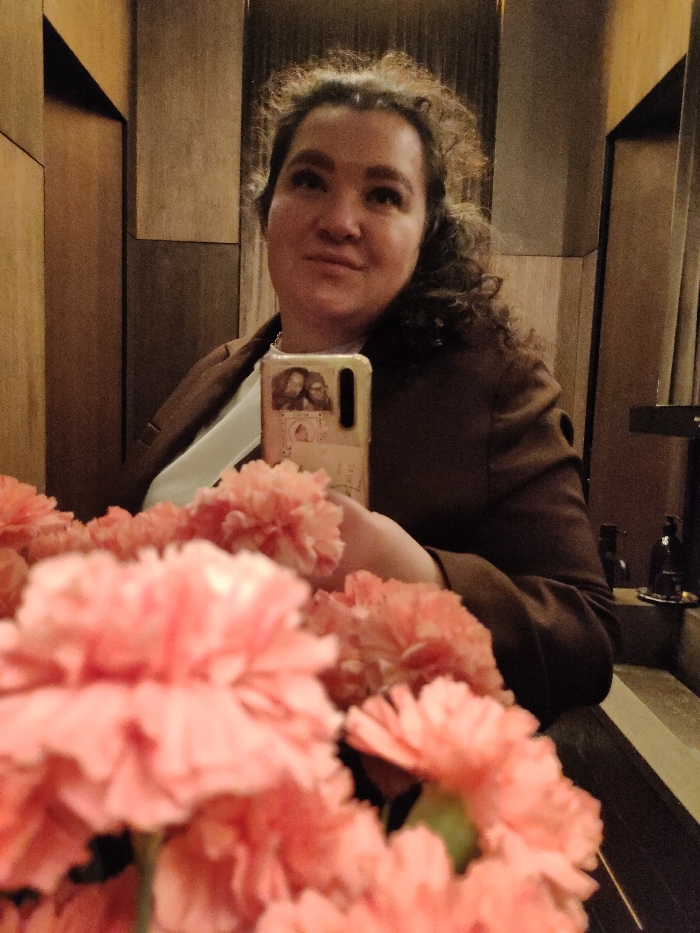 An individual is captured in a mirror selfie within a modern, upscale indoor environment, likely a public lavatory or restroom, situated in Saint Petersburg, Russia. The foreground is dominated by a dense, out-of-focus arrangement of numerous light coral-pink carnations or similar ruffled-petal flowers. The subject, a female with a light complexion and voluminous dark curly hair, appears from the chest up. She wears a dark brown blazer over a light-colored top and a thin silver-toned necklace. Her gaze is directed upwards and slightly to her right, with a subtle smile. She holds a pale yellow or beige smartphone in her right hand, positioned to capture her reflection. The phone case features a graphic design, including a rectangular image of two individuals at the top and additional faint graphics below. The background, visible in the mirror, consists of modern interior architecture featuring wood or wood-effect wall panels arranged in geometric patterns, varying in shades of brown and possibly gray. To the far right, on a dark, sleek horizontal surface, two dark-colored dispenser bottles are arranged on a small, dark, circular tray, further indicating a restroom setting. The lighting is artificial and warm, illuminating the scene.