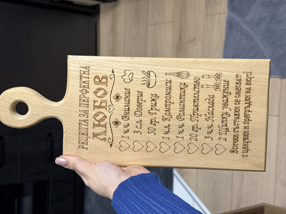 An indoor scene in Burgas, Bulgaria, depicts a light-colored wooden cutting board, approximately rectangular with a rounded handle and a circular hole, held vertically by a person's left hand. The board features laser-engraved Bulgarian text titled "РЕЦЕПТА ЗА ПЕРФЕКТНА ЛЮБОВ" (Recipe for Perfect Love). Below the title, a list of ingredients is engraved, each preceded by a heart icon and accompanied by a small kitchenware pictogram: "1 ч.ч. Внимание" (1 cup Attention, with a chef's hat), "3 с.л. Доверие" (3 tbsp Trust, with steaming lines), "50 гр. Грижа" (50 gr Care, with a bowl and pestle), "1 ч.ч. Компромиси" (1 cup Compromises, with a whisk), "1 ч.ч. Романтика" (1 cup Romance, with a whisk), "20 гр. Приятелство" (20 gr Friendship, with two spoons), "3 ч.ч. Наслада" (3 cups Delight, with a spatula and slotted spatula), and "2 Щипки уважение" (2 Pinches of Respect, with small dots). The concluding instruction reads: "Всички съставки се смесват с целувки и прегръдки на вкус!" (All ingredients are mixed with kisses and hugs to taste!). The hand holding the board exhibits light pink nail polish on the visible fingernails, and a blue, knitted long-sleeved garment is partially visible on the arm. The background is blurred, showing dark furniture or cabinetry in the upper right and a light-colored floor with a dark blue or gray rug in the lower right.