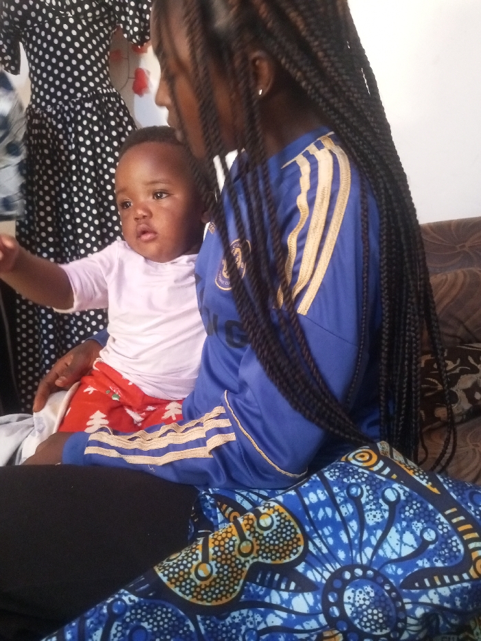A young woman with braided hair sits, wearing a blue Chelsea soccer jacket and patterned blue fabric. She holds a baby in her lap, who wears a light pink shirt and red Christmas-themed pants. The baby’s hand is outstretched. Behind them is a dress with black and white polka dots. The scene appears to be indoors, possibly a home setting.