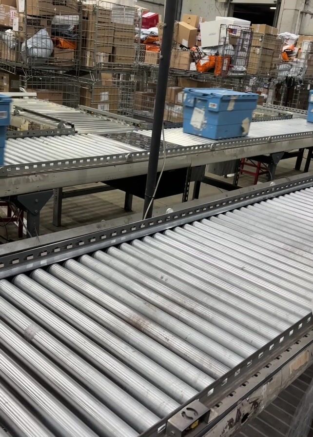 n industrial setting with a network of conveyor belts. Two blue plastic containers are seen moving along one of the conveyor lines. These lines are made of metal rollers and are positioned at an elevated height. Behind the conveyor system, there are wire cages filled with various packages and boxes, indicating a storage or sorting area. The overall environment appears to be a warehouse or distribution center with a high ceiling and industrial lighting.