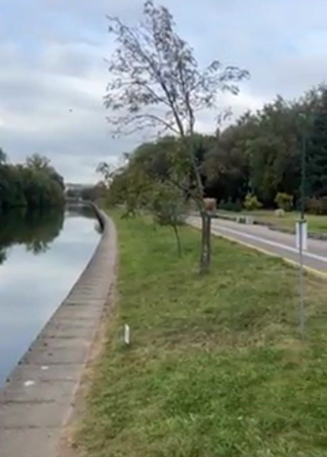 scene next to a canal. The canal is lined with concrete blocks. Next to the canal is a grassy area with a thin, young tree. Beside this is a paved road with double white lines and yellow edges. Beyond the road is a green lawn with various trees and bushes. The sky is overcast. The camera pans slightly to the right.