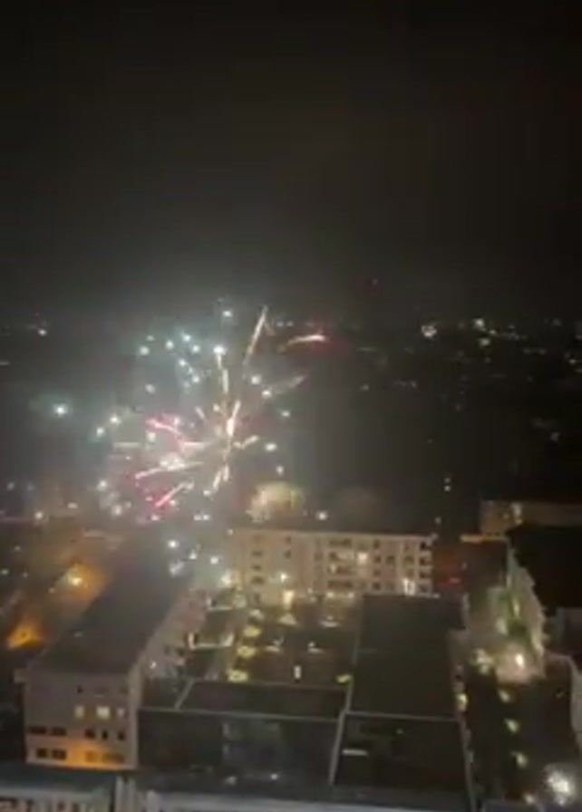 nighttime view of a city from a high vantage point, likely a balcony or rooftop. Fireworks are visible in the distance, bursting with red and white sparks. The city below is illuminated by streetlights and building lights. A bamboo-like railing with small, decorative lanterns runs along the bottom of the frame. The camera pans slightly to the right, revealing more of the city skyline.