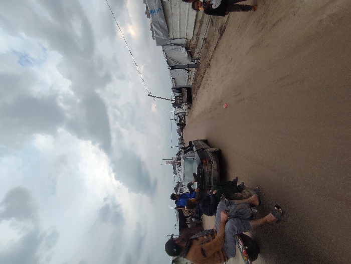 The image depicts an unpaved road in the city of Al-Mawasi under an overcast sky with heavy cloud cover