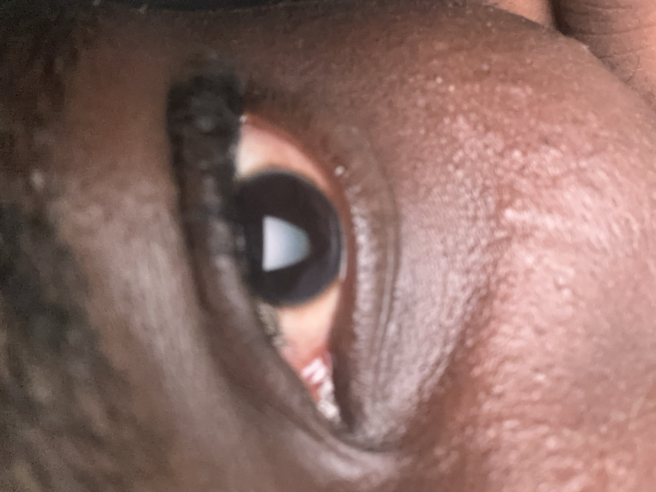 A close-up of a human eye, seemingly Black or dark-skinned, peeks from between slightly parted eyelids. The dark iris reflects a bright light source. Faint redness shows in the corner of the eye. The skin surrounding the eye shows texture and pores. Sparse eyelashes frame the upper lid. The angle and limited view suggest the eye is partially closed or squinting.