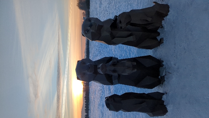 This image presents four dark, polygonal sculptures resembling marmots or groundhogs, arranged on snow-covered terrain