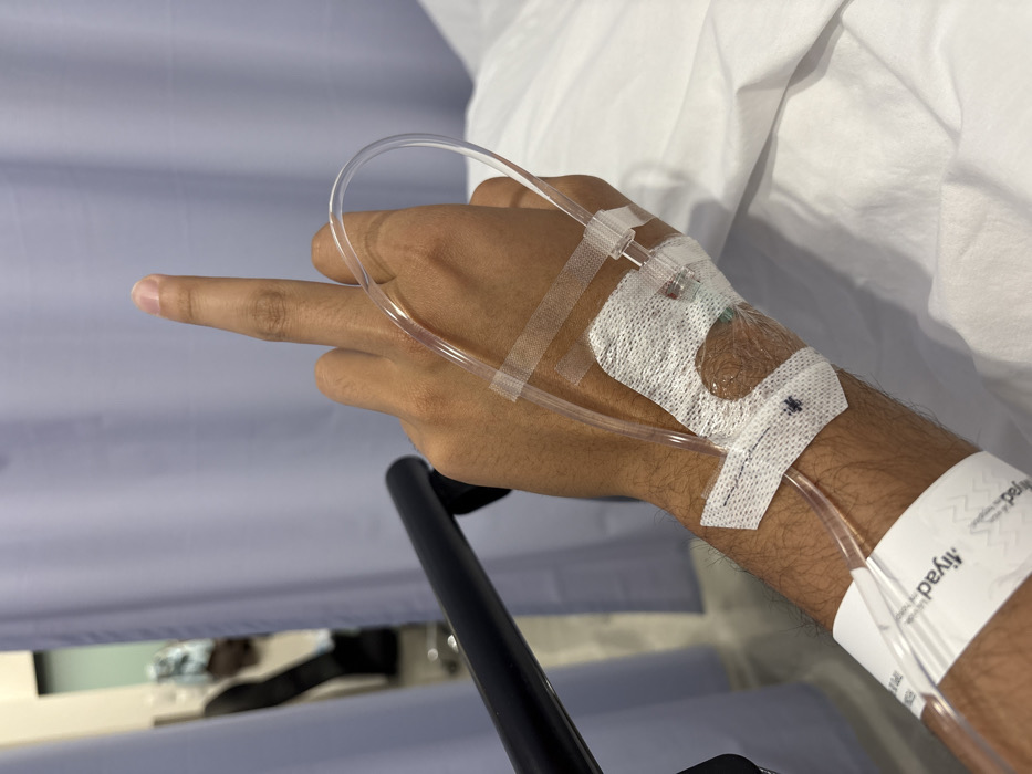 A patient's arm is visible in a hospital setting