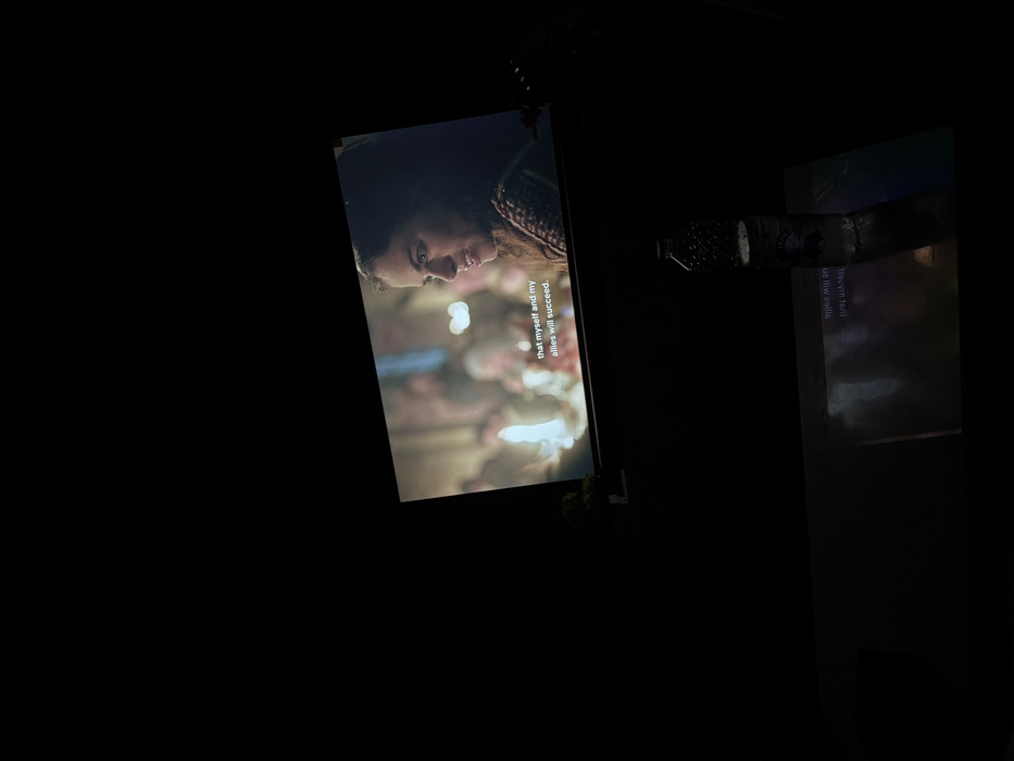 The scene depicts a dimly lit indoor environment, presumably within the city of Ogbomosho, Nigeria, though the specific location is not identifiable from the image. A video is projected onto a screen or wall, dominating the upper portion of the frame. The video displays a close-up of a woman with dark hair, looking to her right with a serious expression, suggesting she is speaking or reacting. The background within the video is blurred, showing figures and warm, soft lights, likely candles or lamps, indicative of a gathering. English subtitles are present on the screen, reading: "that myself and my allies will succeed." Below the projected image, a reflective, dark surface, likely a table, holds a transparent, textured plastic water bottle, partially filled with liquid. The bottle's label is indistinct. The projected image, including the subtitles, is visibly reflected, inverted, and slightly distorted on the table surface beneath the bottle. To the far left of the projection, a small, dark object with green foliage is faintly visible, possibly a small plant. No individuals are visible in the room itself.