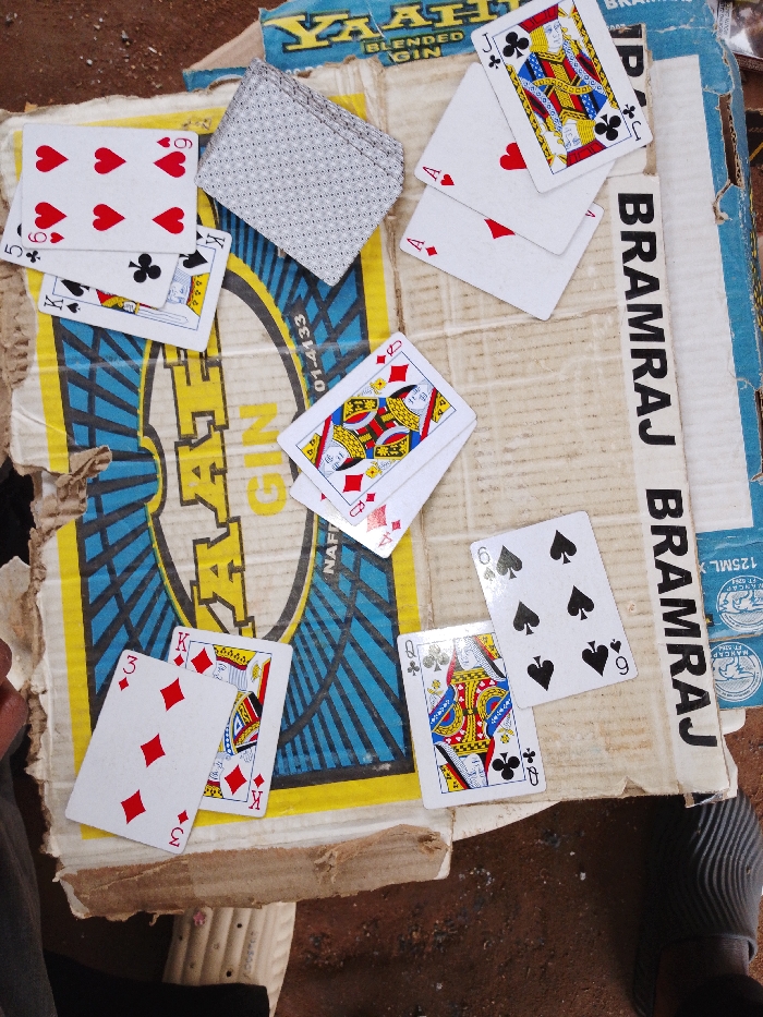 On a reddish-brown earth surface in Vodni, Nigeria, several flattened and worn cardboard boxes serve as a makeshift playing surface. The most prominent box features a blue and yellow graphic with "NAFNA GIN" and "01-4133" visible. Another box edge displays "BRAMRAJ" vertically, while a partial blue-edged box section shows "125ML" and "MANCAP". Scattered across this surface are numerous playing cards. A face-down stack of cards rests near the top-center. Visible face-up cards include: 9 of Hearts, 5 of Hearts, 5 of Clubs, Jack of Clubs, multiple Ace of Hearts, King of Spades, 4 of Diamonds, 3 of Diamonds, King of Diamonds, 6 of Spades, and Queen of Clubs. A person's hand, partially visible on the far left edge, suggests engagement with the cards. A human foot, wearing a dark shoe with light stripes, is visible in the bottom right corner.