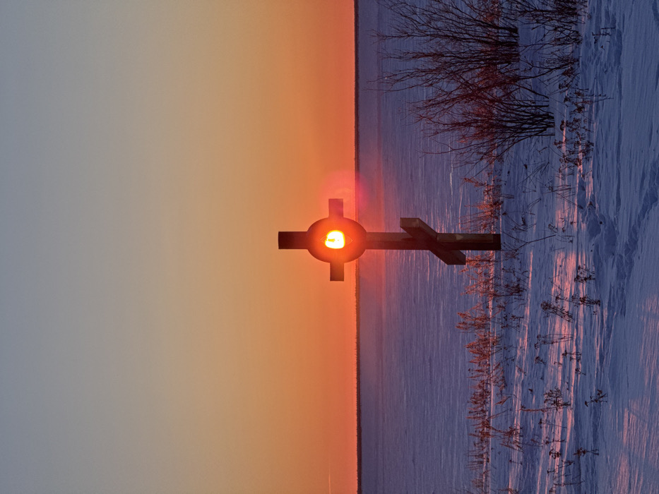 A cross silhouette is centered against a vibrant sunset. The sun seems to be positioned directly behind the cross's center, creating a bright halo effect. The landscape is divided with a horizon line between a colorful sky and a snowy ground. Sparse, bare bushes and dried grasses stand out against the snow. The entire scene is bathed in warm, golden light, with the snow reflecting the colors of the sunset.