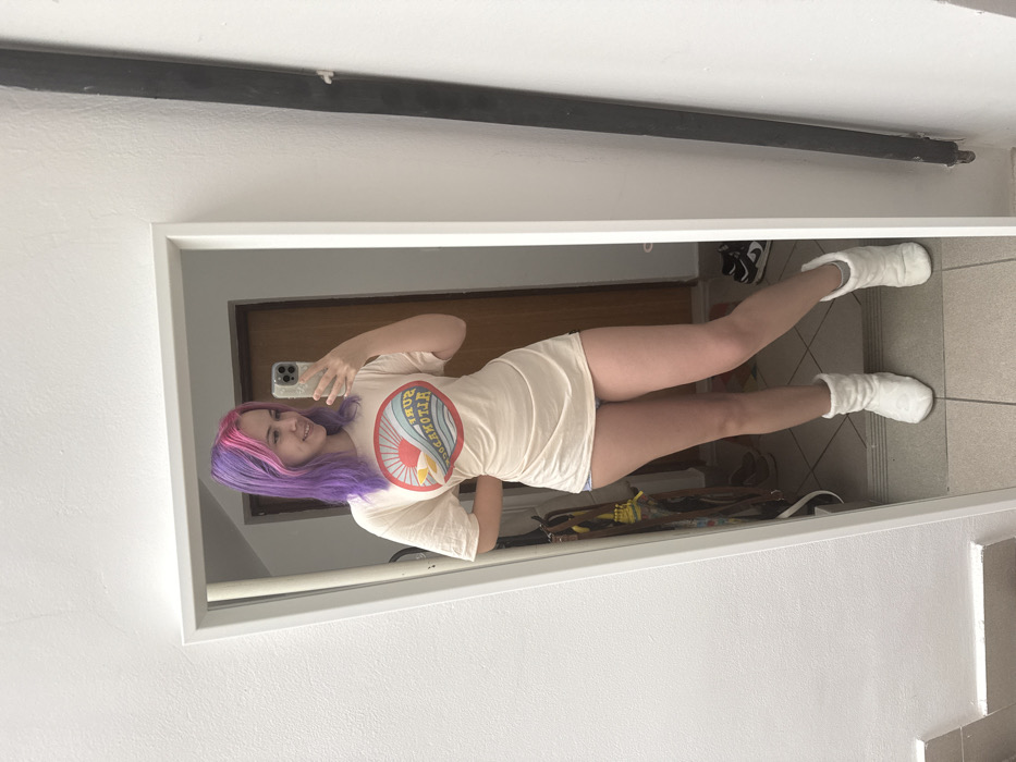 A female individual is depicted taking a mirror selfie within an indoor setting in the City of Zagreb, Croatia. The subject has medium-length hair, dyed purple with distinct pink streaks, and a light complexion, smiling towards the camera. She wears an oversized, light beige t-shirt featuring a circular graphic with a red sun, blue waves, and a yellow surfboard, accompanied by the text "SURF CALIFORNIA." Blue shorts are partially visible beneath the t-shirt. She is wearing white, furry, ankle-high boots. In her right hand, she holds a silver-colored smartphone with a textured case, positioned to capture her reflection in the large, white-framed mirror. The reflected background reveals a dark brown wooden door, light-colored walls, and a light-tiled floor. To the left within the mirror, indistinct objects such as an umbrella stand or hanging items are partially visible. To the right, a pair of dark sneakers with white soles are on the tiled floor. The immediate environment outside the mirror consists of plain white walls flanking the mirror and the same light-tiled floor. A dark vertical pipe is affixed to the white wall on the right side of the mirror.