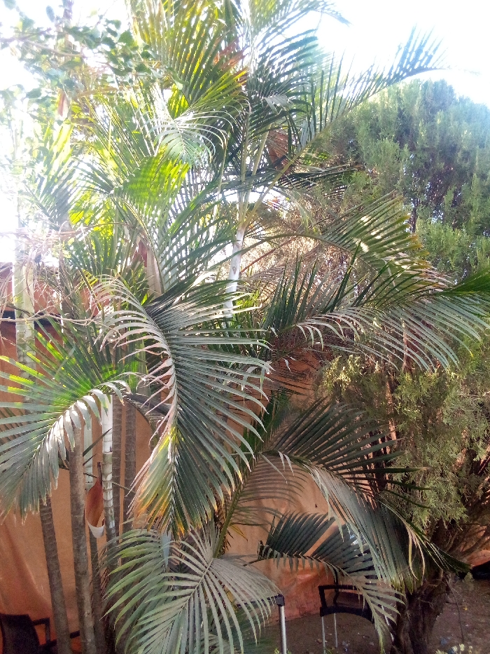This image depicts an outdoor environment in Jos, Nigeria, dominated by dense tropical foliage. Multiple palm trees, characterized by long, segmented green fronds, occupy the central and left portions of the frame. The fronds display varying shades of green, with some lighter areas indicating direct sunlight and backlighting, creating bright highlights. Behind the palm trunks on the left, a light brown or tan-colored solid surface, possibly a wall or tarp, is partially visible. To the right, a densely packed green coniferous-type tree stands. In the lower right quadrant, partially obscured by palm fronds, a dark-colored outdoor chair with a metal frame and seat is present. Adjacent to the chair, a vertical metal pole or stand is visible. The ground cover is not distinctly identifiable. No individuals or active interactions are depicted. The scene is illuminated by natural daylight.