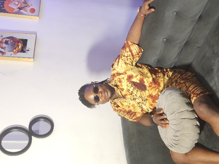 An adult male with dark skin and braided hair is seated on a dark grey upholstered sofa in an indoor setting. He wears small, oval-framed sunglasses and is dressed in a matching short-sleeved button-down shirt and shorts featuring a brown, yellow, and white tie-dye or batik pattern. A black beaded bracelet is visible on his left wrist, and a gold-toned watch is on his right. A light grey, round, pleated cushion rests on his lap, with his left hand placed on top of it. His right arm extends along the sofa's backrest. The background consists of a white wall decorated with two black-framed circular mirrors on the left side and two gold-framed abstract art prints on the right. A faint purple light source illuminates the right portion of the wall. The specific location within Lagos, Nigeria, cannot be determined from the visual information provided in the image.