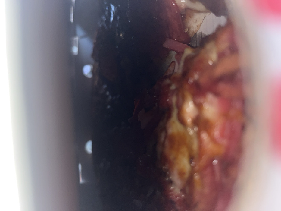 The image displays a close-up, low-angle view of the interior of a container, likely a pizza box, situated in Applecross, Australia. The central subject is a food item, consistent with a pizza, occupying the lower and mid-sections of the frame. The food features a visible crust, melted cheese with areas of browning, and numerous red-hued toppings, indicative of processed meats such as pepperoni or ham, interspersed with darker elements that appear to be sauce or other ingredients. The upper portion of the image is predominantly dark, suggesting the inside of a lid or the container's upper structure, against which several blurred, semi-circular and linear light reflections are discernible. The immediate foreground shows a white surface with a red pattern, characteristic of food packaging. No human figures or discernible actions are present in the static scene.