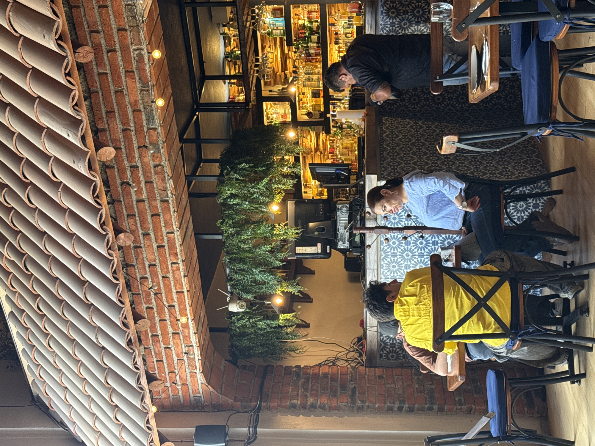 interior of a bar or restaurant, possibly in Tepeji de Ocampo, Mexico. Patrons are seated at tables with wrought iron-style chairs. One man is wearing a yellow jacket, another a light blue shirt, and a third a dark shirt. A bartender is behind the bar, which has illuminated shelves displaying bottles of alcohol. The space is decorated with plants and string lights, and the building appears to have a red tile roof.