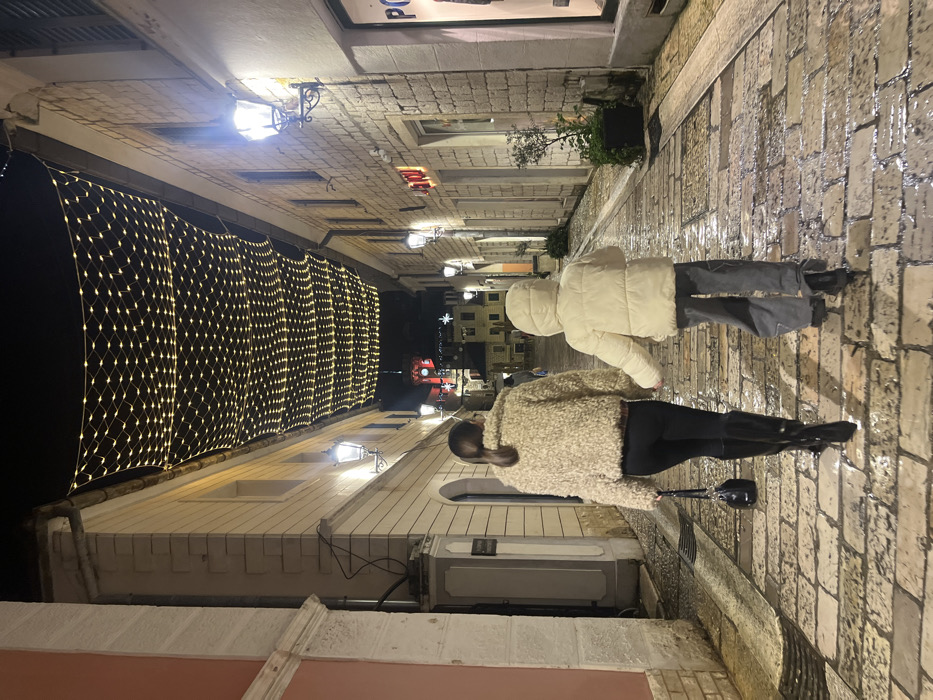 Two people are walking down a narrow, cobblestone street at night. The street is decorated with strings of lights, and buildings line either side. The person in the foreground wears a fuzzy jacket and black pants. The other person wears a white puffer jacket and grey pants. The ground appears wet, reflecting the ambient light. Streetlights illuminate the alleyway, casting shadows on the stone walls.