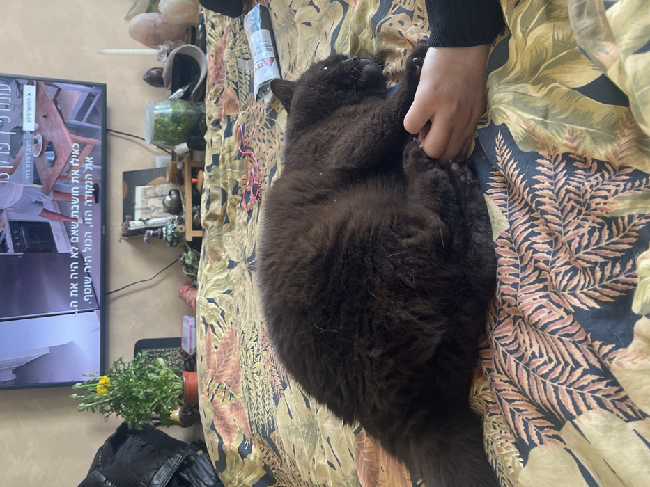 A dark brown, long-haired cat is lying on a bed, facing right, interacting with a human hand. The human's right hand, with manicured fingernails, gently grasps the cat's left front paw. The cat's claws are visible. The bed is covered by a duvet featuring a dark blue, olive green, and reddish-brown tropical leaf pattern. In the background, a flat-screen television is mounted on a light-colored wall, displaying a program with Hebrew text, showing a kitchen scene with a man in a white shirt and shorts near a wooden table. Below the television, a cluttered surface holds a potted plant with yellow flowers, a black bag, a clear glass container resembling a terrarium, a small pink plastic box, a white candle, and what appears to be a large light-colored crystal or salt lamp, among other items. The scene is brightly illuminated, occurring within a room in Or Akiva, Israel.