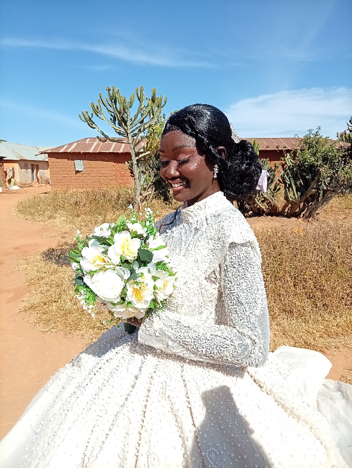 A female individual, identified as a bride, is depicted outdoors in Kerang, Nigeria, smiling with closed eyes while looking downwards and to her right