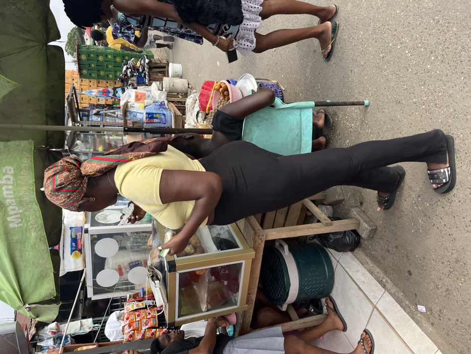 The scene depicts a bustling outdoor street market environment in Ablekuma, Ghana. **People:** * **Primary Subject:** An adult female with dark skin stands centrally, facing right in profile. She wears a yellow short-sleeved top, black high-waisted flared trousers, and black platform slides with white stripes. A brown and green patterned headscarf is wrapped around her head, and she has small hoop earrings. She holds a small, light-colored object, possibly currency or a wrapper, in her right hand. Her left hand is near a glass display case. * **To the left:** A partial view of a person, likely female, stands with their lower body visible, wearing a light grey pleated skirt and black flip-flops. * **Behind the display case:** A person is seated, visible from the chest down, wearing a white shirt. * **To the right of the primary subject:** A person is seated on a light blue plastic chair, facing away from the camera, wearing a black top and dark flip-flops. Their arm rests on a white plastic tray that holds a bowl containing small, round, orange fruits. * **Further right:** Another female stands, partially visible, wearing a patterned dress with a white lace hem and dark flip-flops. She holds a dark mobile phone. * **In the background:** An individual in a yellow shirt walks away from the camera. Other indistinct figures are present. **Subjects/Objects:** * **Market Stall/Display:** A gold-framed glass display case rests on a wooden stand. It contains various food items, including fried snacks or pastries, and circular white objects behind the glass. * **Overhead:** A large green market umbrella provides shade, bearing "Mpamba Mobile Money" text in white. * **Market Goods:** Shelves and stalls in the background display packaged snacks (red bags), plastic water bottles, rolls of white paper (possibly tissue), and numerous stacks of green plastic crates. * **Underneath Stall:** A green and white cooler or container is positioned under the wooden stand, along with a black plastic bag on the ground. * **Ground Surface:** The ground transitions from a tiled surface on the left to an asphalt or concrete surface on the right. **Actions/Interactions:** * The primary subject appears to be involved in a transaction or awaiting service at the display case. * Other individuals are standing, sitting, or walking within the market space, suggesting typical market activity. **Environment:** The scene is an open-air commercial area, characteristic of a roadside market or street vendors, with various goods displayed for sale and multiple individuals engaged in commerce or passing through. The sky is overcast.