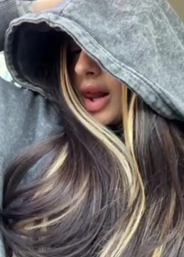 A person is visible in the video. The individual has long brown hair with blonde highlights and is wearing a gray hooded sweatshirt with the hood up. They are sitting indoors. The person sticks their tongue out, revealing a tongue piercing. The background is blurred, but appears to be a car interior.
