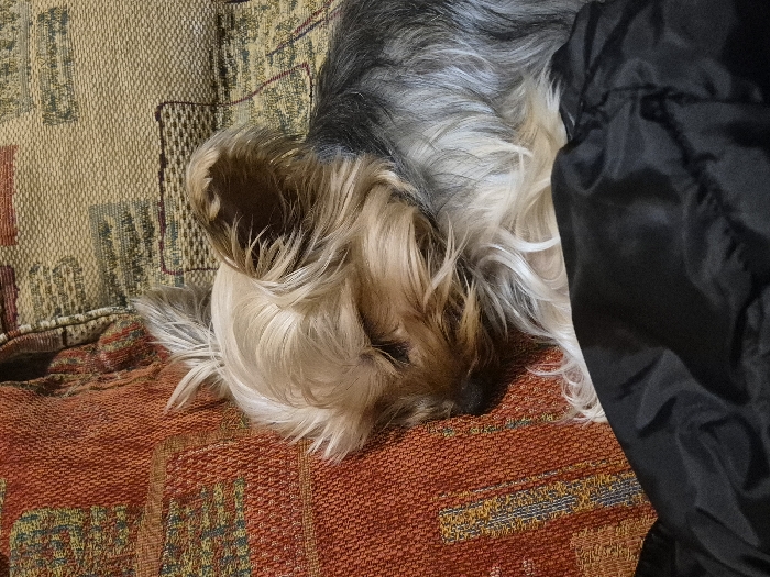 - "An image taken indoors in Pavlikeni, Bulgaria, depicts a small, long-haired dog, resembling a Yorkshire Terrier, lying on a patterned sofa or cushion" by FM-WH1aF2, licensed under CC BY 4.0