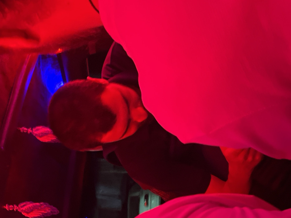 The image depicts an indoor scene within As-Salihiya Municipality, Syria, illuminated predominantly by strong red artificial lighting, with a visible blue light source in the upper right background. Three individuals are present. In the mid-ground, a male with short dark hair, wearing a dark collared shirt, is seen looking downwards. His hands are visible at the bottom of the frame, engaged in an unidentifiable action. Portions of two other individuals are visible in the foreground; their shoulders and upper bodies, clad in light-colored attire appearing pink/red under the lighting, flank the central figure. In the upper left background, two decorative items resembling hanging feathers or dreamcatchers are visible. To the left of the central figure, a blurred, light-colored vehicle, possibly an SUV or van, is faintly visible through what appears to be a window or opening. The environment suggests a social or entertainment venue.