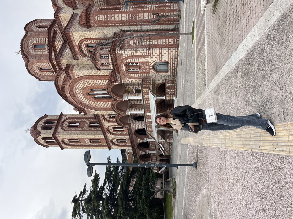 The image depicts a young adult female standing on a paved plaza in front of the Metropolitan Church of Saint John the Baptist in Xanthi, Greece