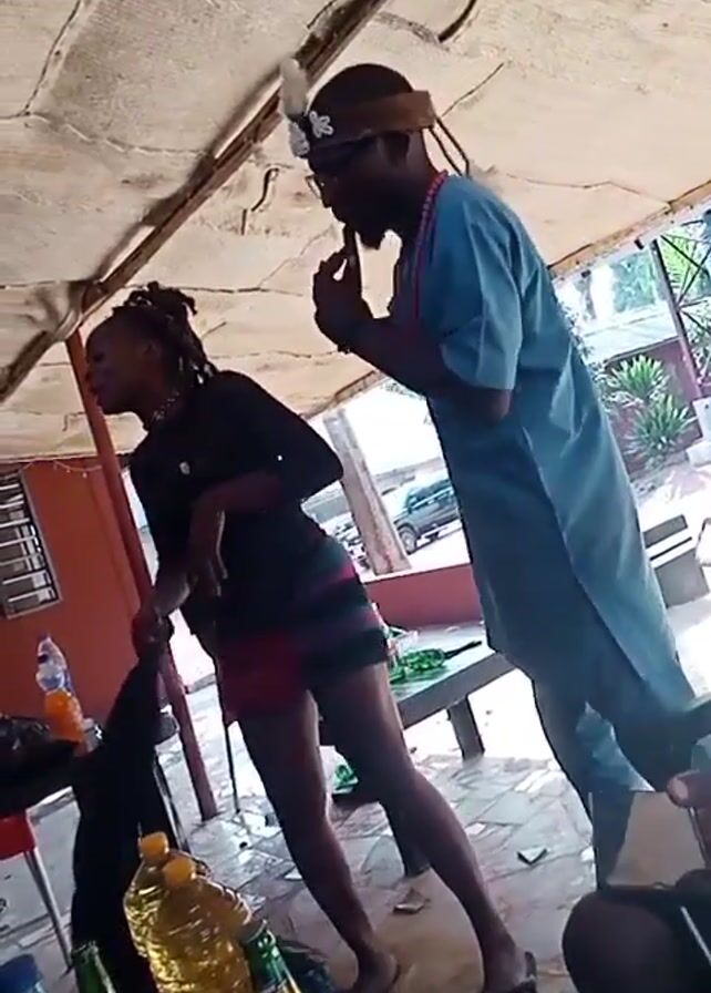 two people, a woman and a man, standing under a covered outdoor area. The woman is wearing a black top and a short skirt with stripes. She has dreadlocks and is holding a black object that looks like a chair or a piece of fabric. The man is wearing a blue outfit and a beaded necklace, along with a hat with a feather and glasses. He is standing next to her and talking, gesturing with his hands. There are tables with drinks and bottles on them. Two other men are sitting at one of the tables, one of whom is smoking. The setting appears to be a casual outdoor bar or social gathering place.