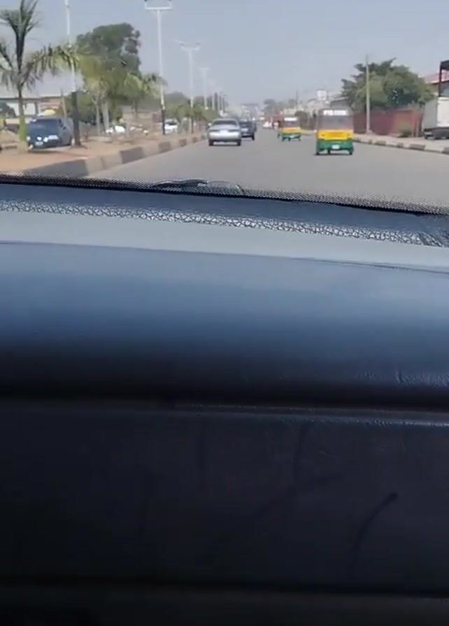 The video is shot from inside a car driving on a multi-lane road during daytime