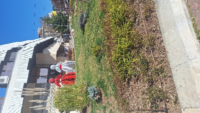 The image depicts an outdoor urban scene in Dupnitsa, Bulgaria, under clear blue skies and bright daylight. The foreground features a grey concrete sidewalk bordering a planted dirt area containing brown drip irrigation lines and several small green and yellow-green shrubs. Beyond this, a grassy lawn displays a mix of green and dry patches, along with a small bluish-green conifer-like bush. Centered within the lawn, two large, decorative, anthropomorphic figures stand upright. The figure on the left is predominantly red, and the figure on the right is silver with a red waistband, both appearing to be constructed from reflective material shaped into skirted torsos. Behind these figures, a paved pedestrian walkway is visible, where several indistinct human figures are observed walking in the midground. The left background is dominated by a multi-story building featuring a distinctive white facade with horizontal louvered panels on its upper levels and a beige lower section with large, dark-tinted windows. Tall, feathery ornamental grasses are planted directly in front of the building's base. To the right, older buildings with yellow facades and various trees, including bare deciduous and green coniferous types, are partially visible against the clear blue sky. A utility pole is also present on the right side of the midground.