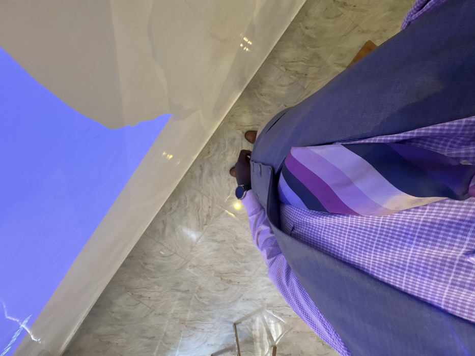 The image, captured in Jos, Nigeria, depicts an individual from a low-angle perspective, focusing on their torso and lower legs. The person wears a purple and white checkered long-sleeved shirt, a grey suit vest, and a multi-striped tie featuring purple, pink, and grey tones. A dark smartwatch is visible on the left wrist, and brown dress shoes are worn on the feet. The environment consists of a highly reflective, light-colored marble-patterned tiled floor. Above the floor, a curved, glossy white architectural feature rises, separating the lower half from an upper area illuminated with blue light. Reflections of overhead light sources are discernible on both the white surface and the blue-lit section. A partial reflection of another person, clad in a dark top and brown shoes, is visible on the polished floor surface.