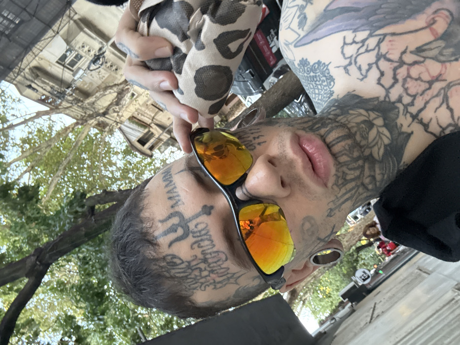 A close-up shot of a tattooed person wearing yellow-tinted sunglasses