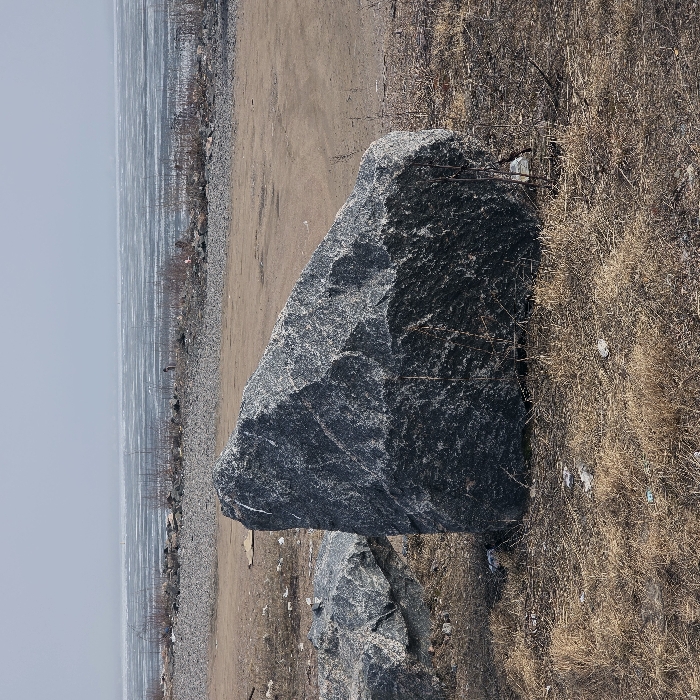 The image depicts a coastal scene in Kronstadt, Russia, under a hazy, light gray sky. In the foreground, dry, yellowish-brown grass and sparse, leafless vegetation cover a patchy, light brown dirt ground, interspersed with small white and blue debris. Two large, dark gray granite boulders are prominent; the larger, angular one is positioned centrally to the right, while a smaller, lighter gray boulder is partially visible to its left. The midground consists of a wide expanse of light brown, unpaved earth, which transitions into a darker gravelly shoreline dotted with thin, leafless shrubs. The background reveals a vast body of water, likely the Gulf of Finland, predominantly covered by fragmented sheets of gray ice and slush, extending towards a faint, hazy horizon. A single, dark, indistinct figure or object stands near the water's edge among the vegetation in the mid-right background. No discernible actions or interactions are occurring.