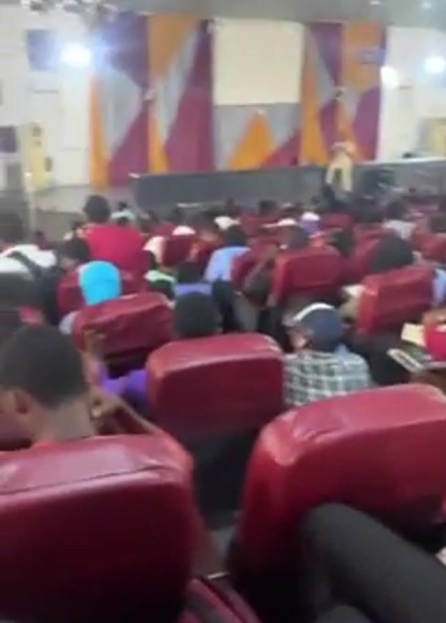 n indoor space that appears to be an auditorium or a large meeting hall. It's filled with rows of red, cushioned seating, occupied by numerous individuals of varying ages and ethnicities. A figure can be seen standing on a stage in the distance at the front of the room, potentially giving a presentation or speech. The auditorium has large windows covered with gold-colored curtains and a high ceiling, and the lighting appears bright, with overhead lights illuminating the scene. The person holding the camera is seated among the audience, slightly off-center, and occasionally moves the camera's perspective to survey the room. Many people are looking forward, likely toward the speaker.