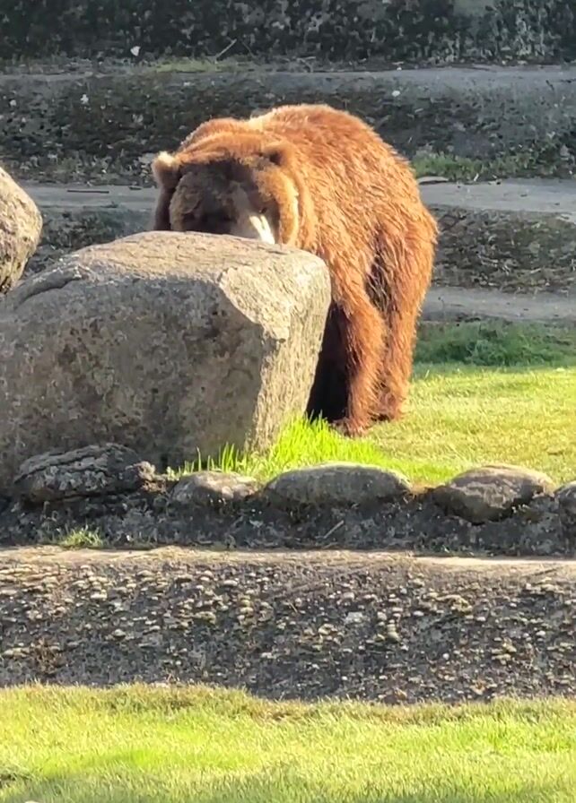 A brown bear stands on green grass next to a large grey rock. The bear appears to rub its head against the rock. The area includes other rocks and concrete structures in the background. The bear is the main focus of the shot.